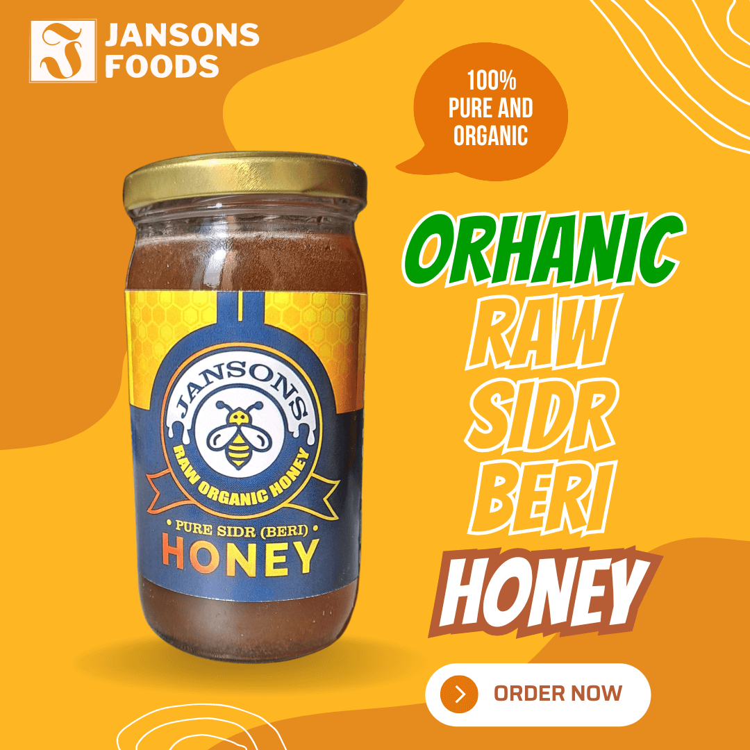 Indulge in the golden richness of Jansons Organic Raw Sidr (Beri) Honey, crafted by bees that collect nectar from wild Sidr trees in the forests of Karbogha Sharif, Khyber Pakhtunkhwa. Harvested at peak purity using traditional, unheated methods, this honey retains its full spectrum of enzymes, antioxidants, vitamins, and minerals.